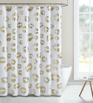 Adorn your bathroom with this fashion chic fabric shower curtain by Kate Aurora Living. Made of mold and mildew resistant fabric and a Gold metallic foil design this shower curtain is the perfect addition to your chic decor. Machine washable and machine dryable for easy care these curtains also feature reinforced hook holes to prevent tearing at the top. Designed to fit most standard showers and baths. Ready to use right out of the package. Iron and steam safe.