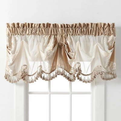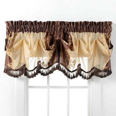 Modern elegance. Floral embroidery adorns this voile and faux-silk valance for sheer sophistication. Bring out the beauty of your living room decor with this chic valance. Fringe trim with beaded accents offers fashionable flair. These come fully hemmed for a cleaner and fresher look on your window. Can be used alone or coordinated with your favorite window treatment.
